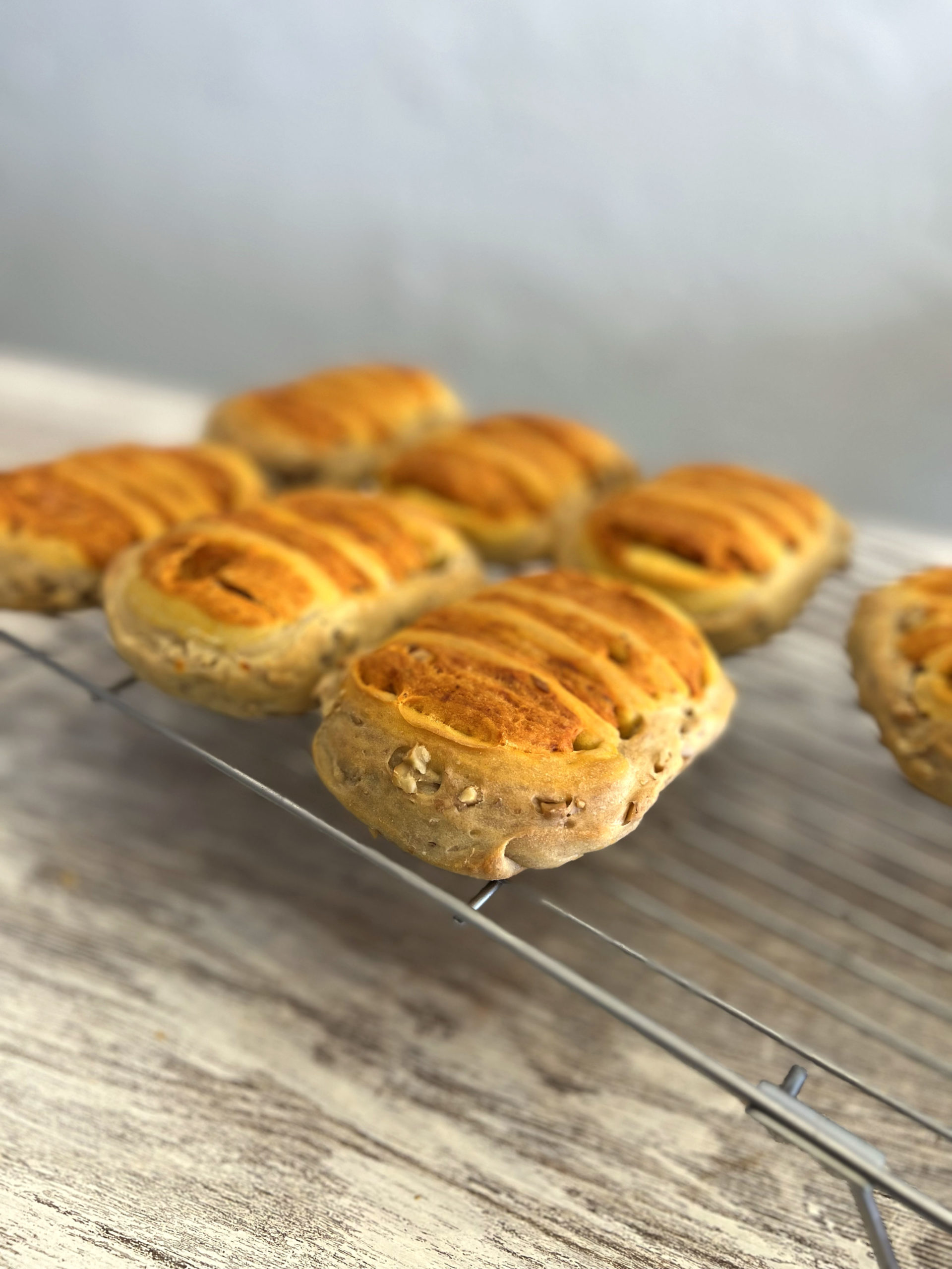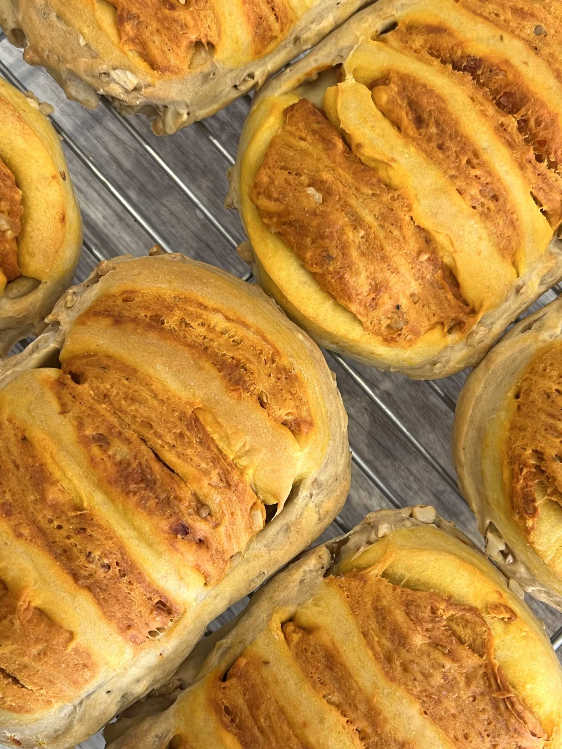 Elaboramos este panecillo con 3 masas totalmente artesanales: masa de "sobrasada" plant-based (roja), masa con levadura nutricional y cúrcuma (amarilla) y masa de nueces troceadas (cobertura). La "sobrasada" la hacemos con una mezcla de tomates deshidratados, nueces y pimentón ahúmado. ¡Una mezcla irresistible! *Contiene gluten y nueces. *Puede contener trazas de sésamo, cacahuete, soja y otros frutos secos.