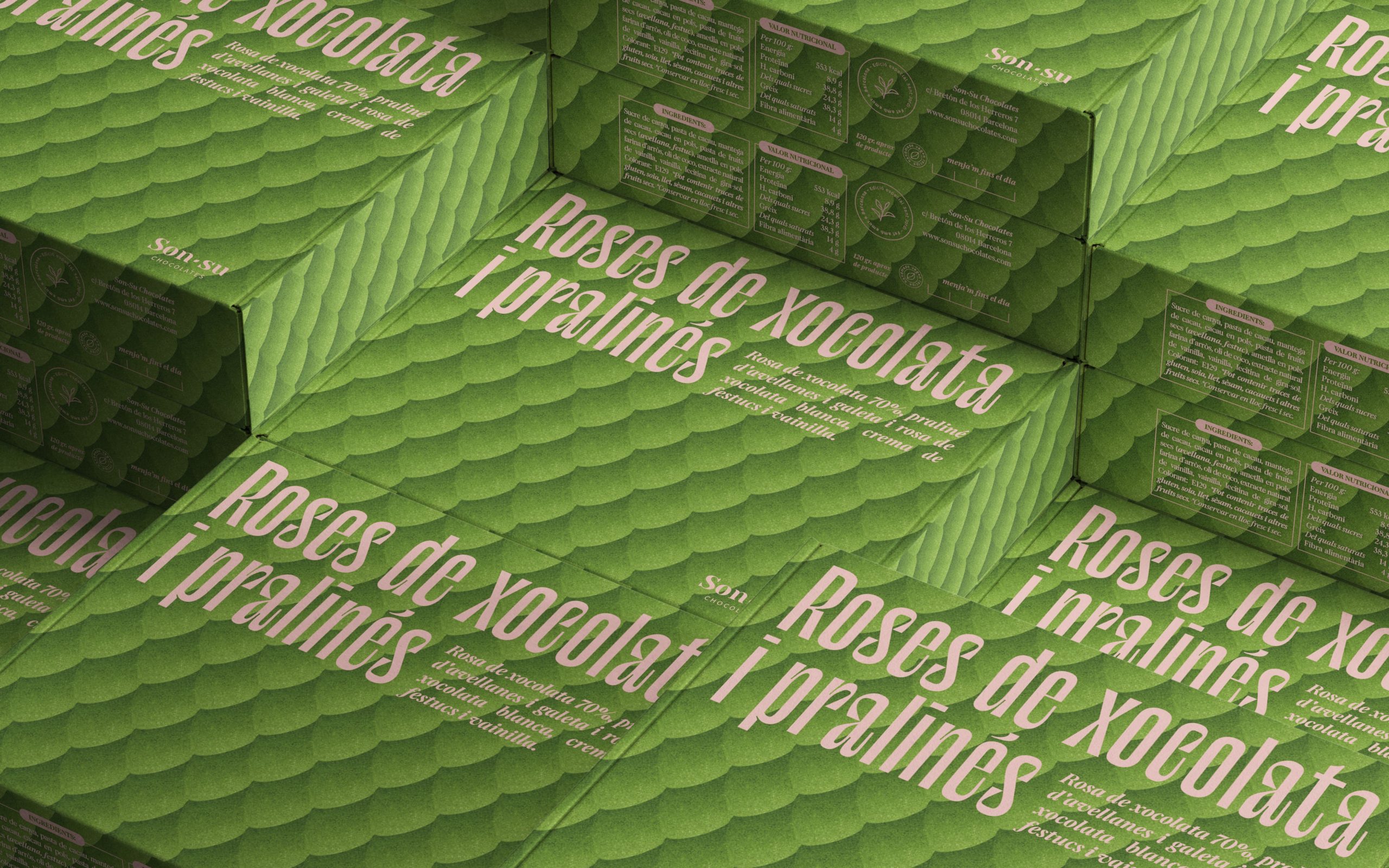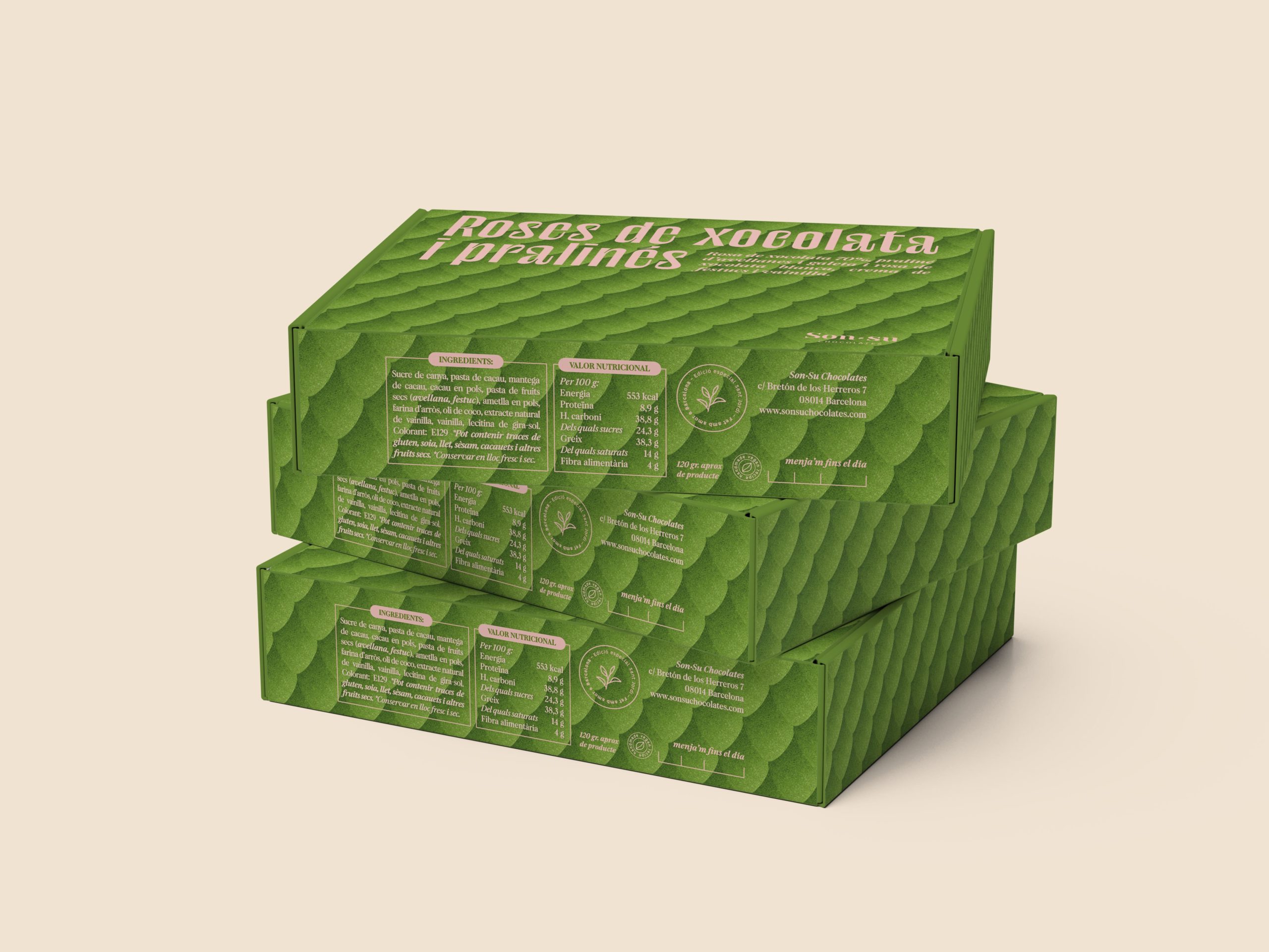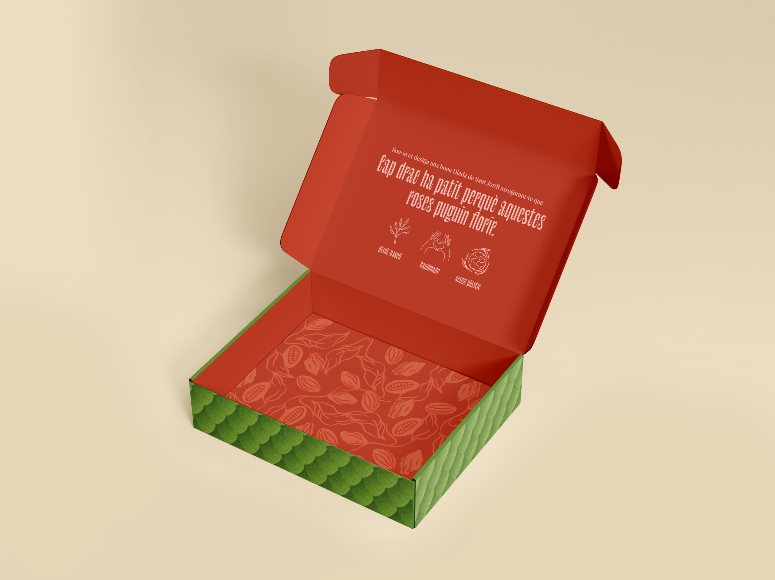 En el interior podréis deleitaros con dos rosas de chocolate y praliné. Una rosa de chocolate negro 70%, praliné de avellanas hecho por nosotras y galleta casera sin gluten, y una rosa de chocolate blanco 100% plant-based, crema de pistachos elaborada en nuestro obrador y vainilla natural.