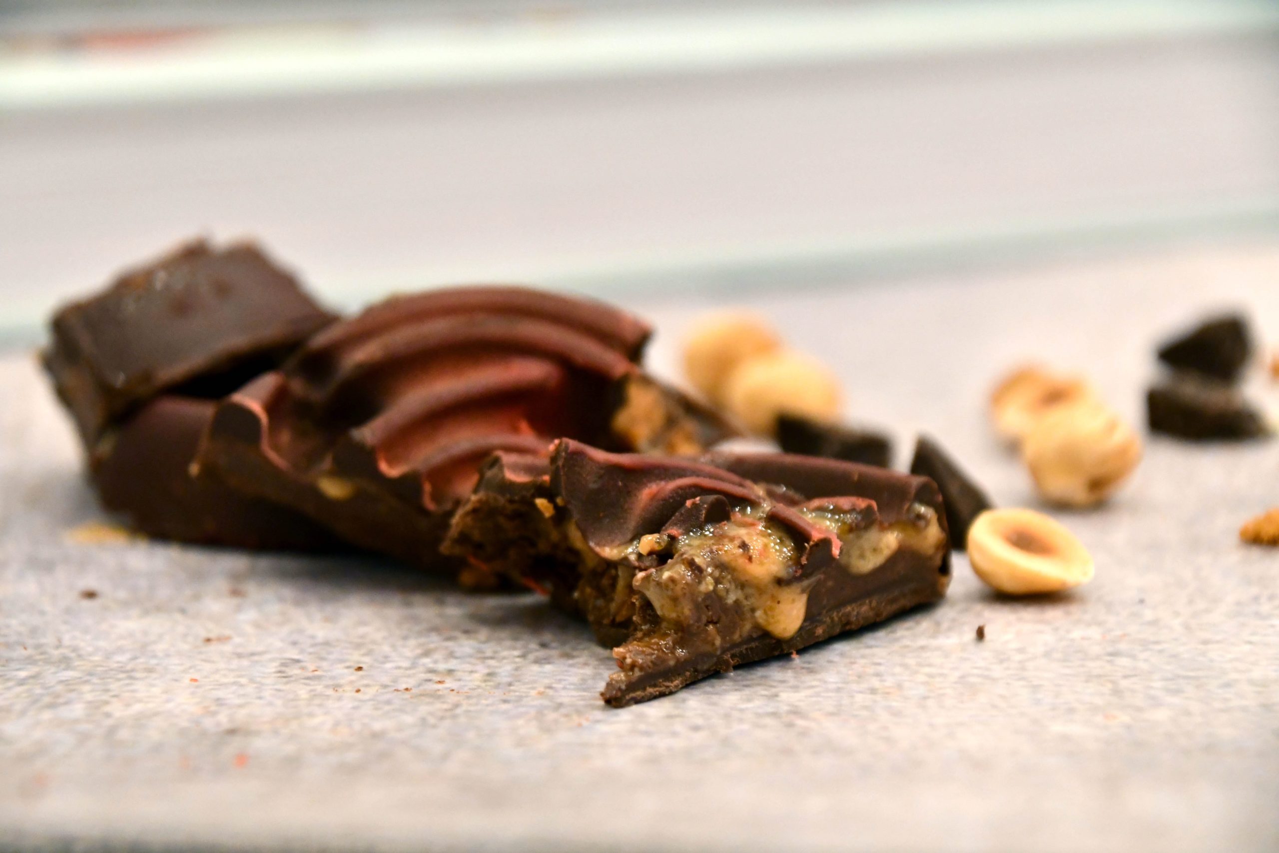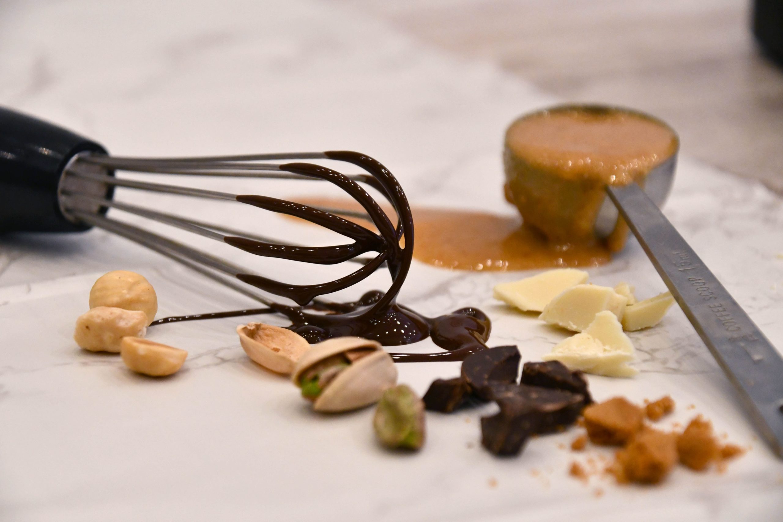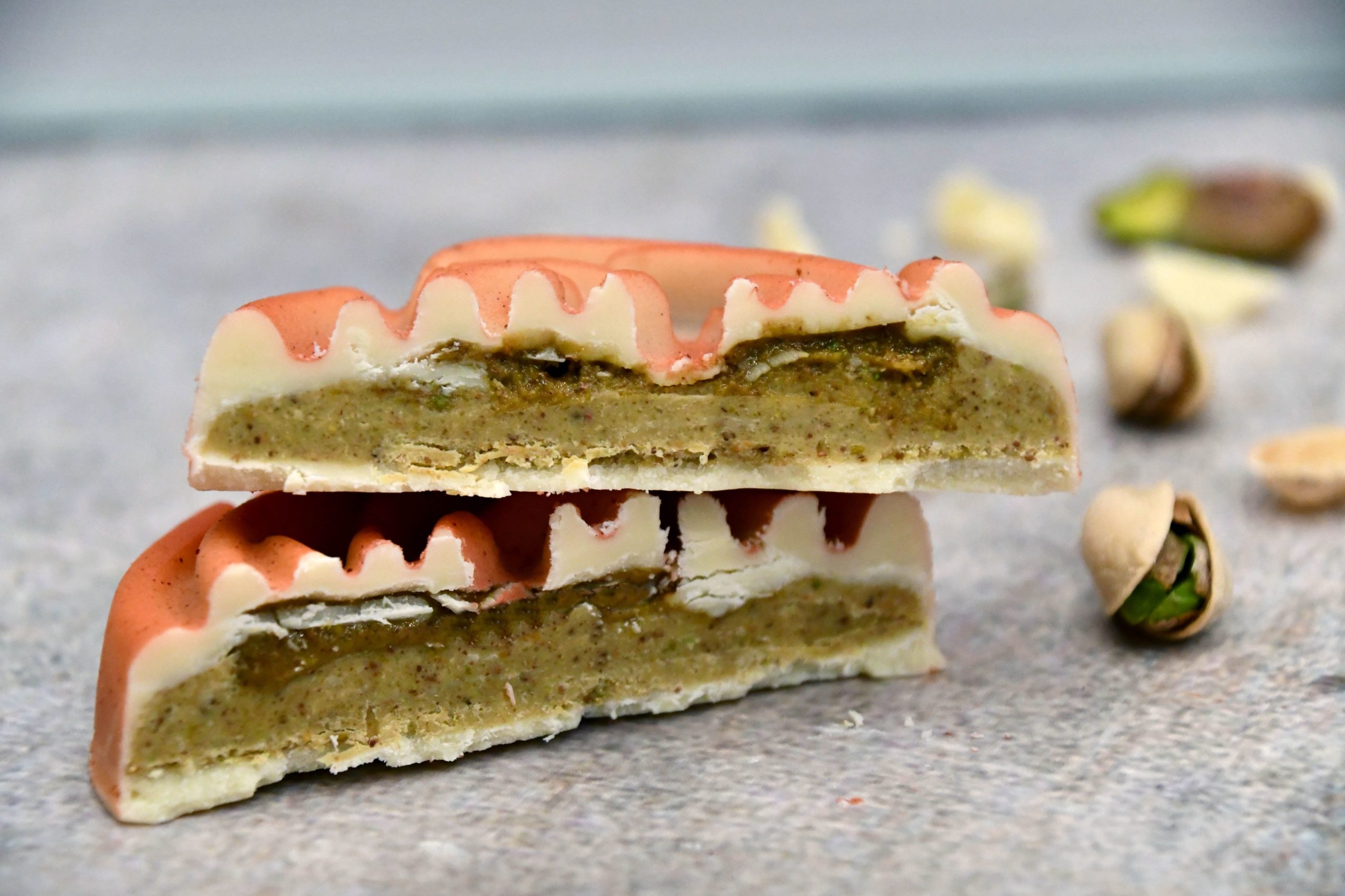 En el interior podréis deleitaros con dos rosas de chocolate y praliné. Una rosa de chocolate negro 70%, praliné de avellanas hecho por nosotras y galleta casera sin gluten, y una rosa de chocolate blanco 100% plant-based, crema de pistachos elaborada en nuestro obrador y vainilla natural.
